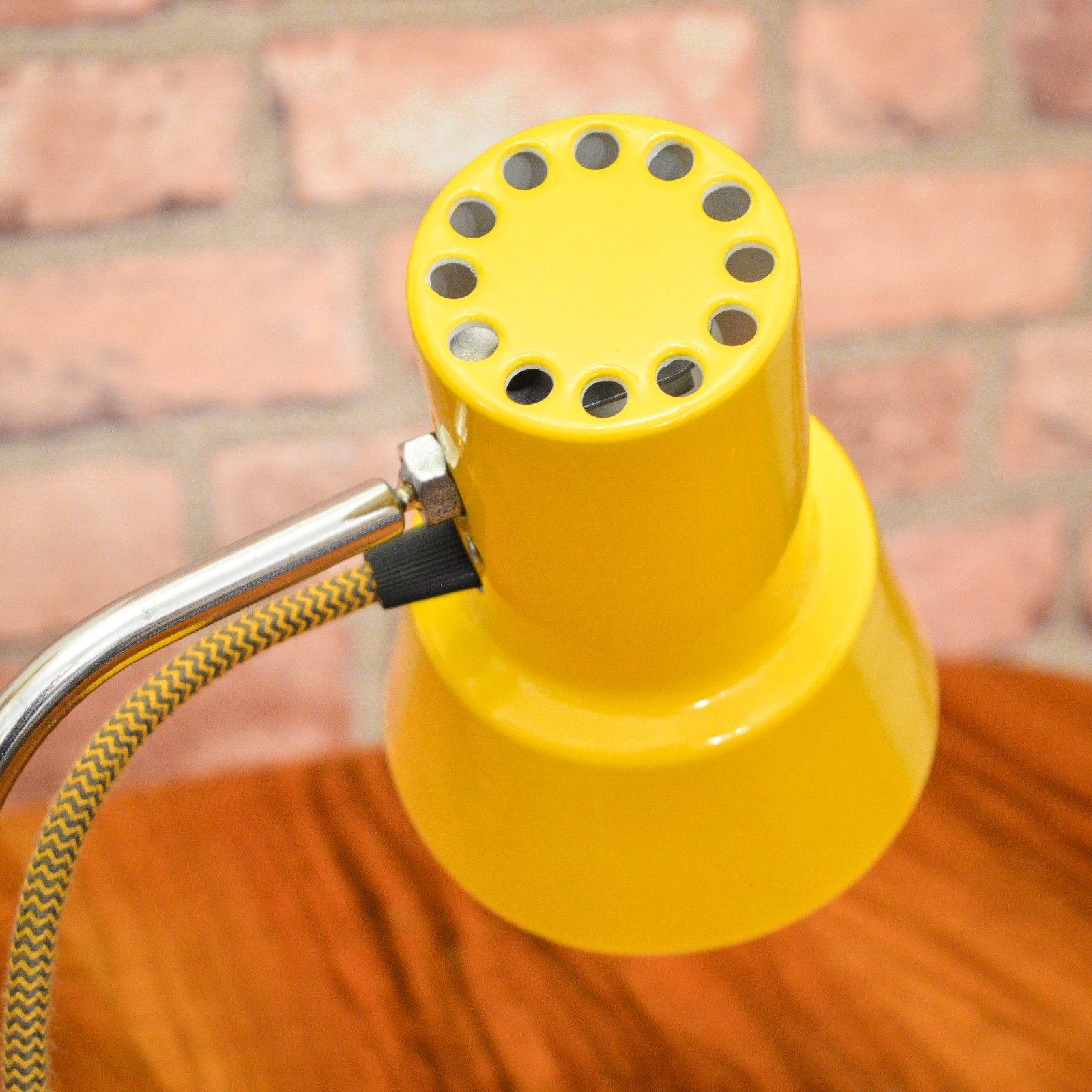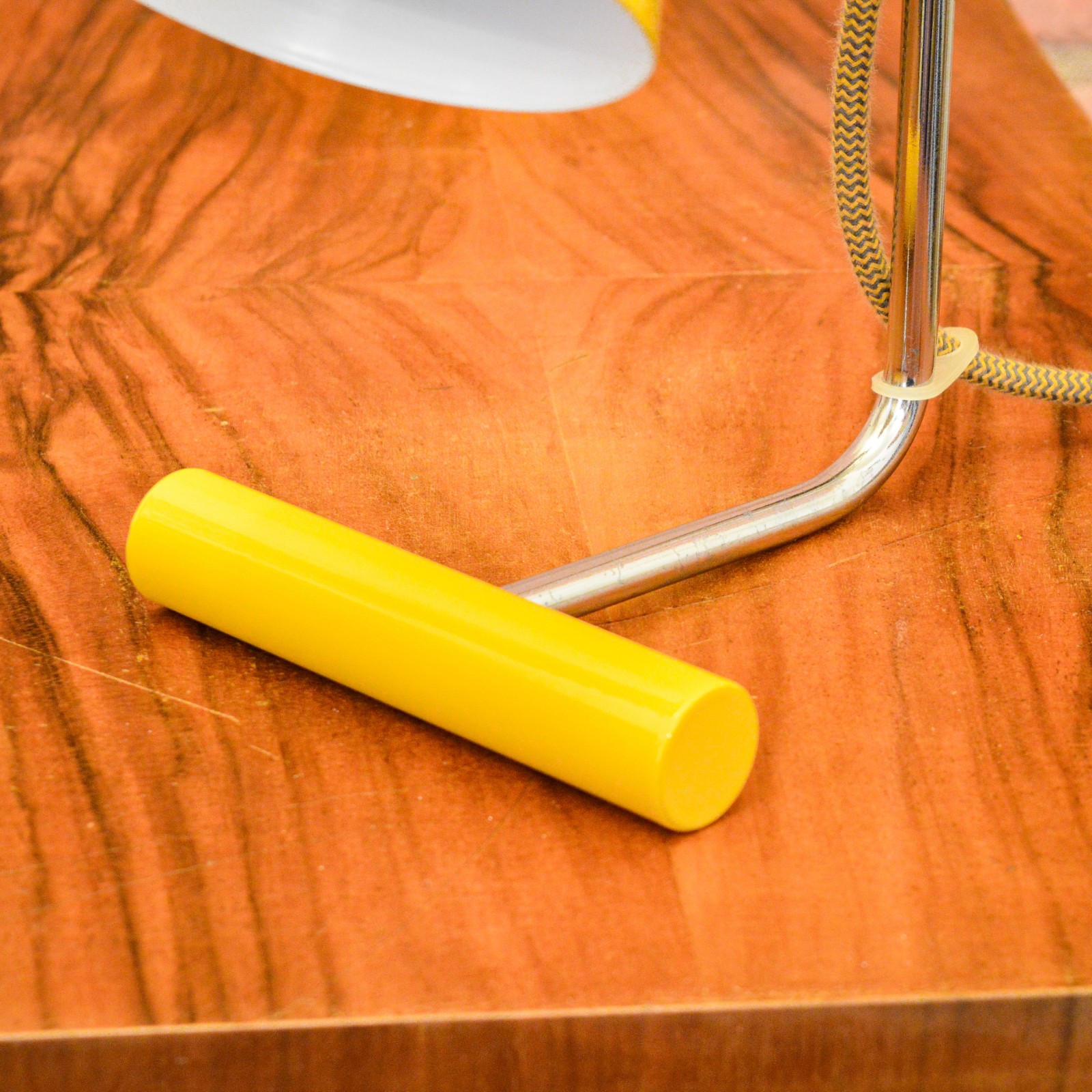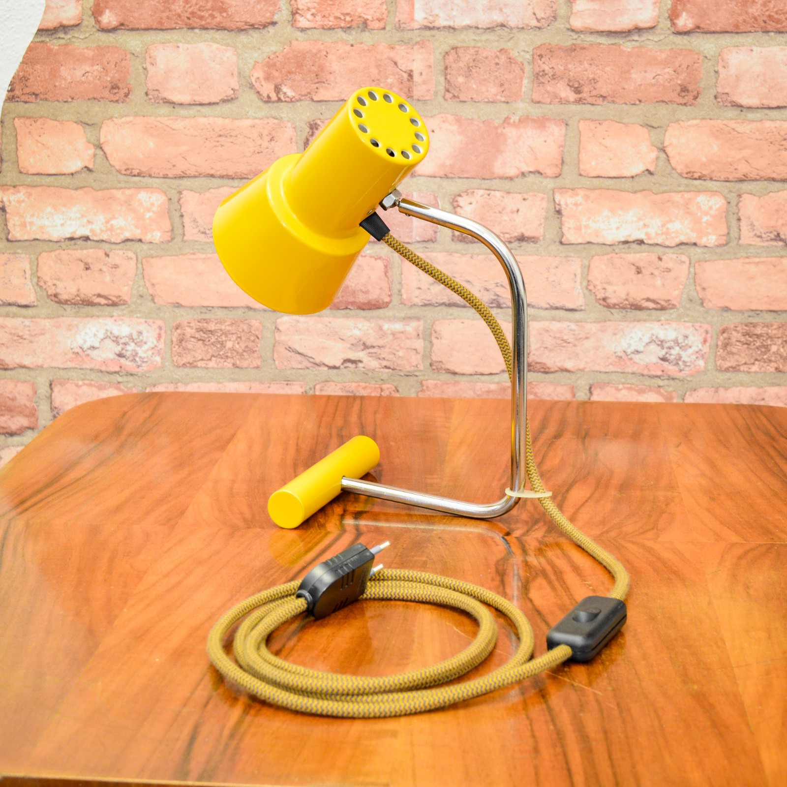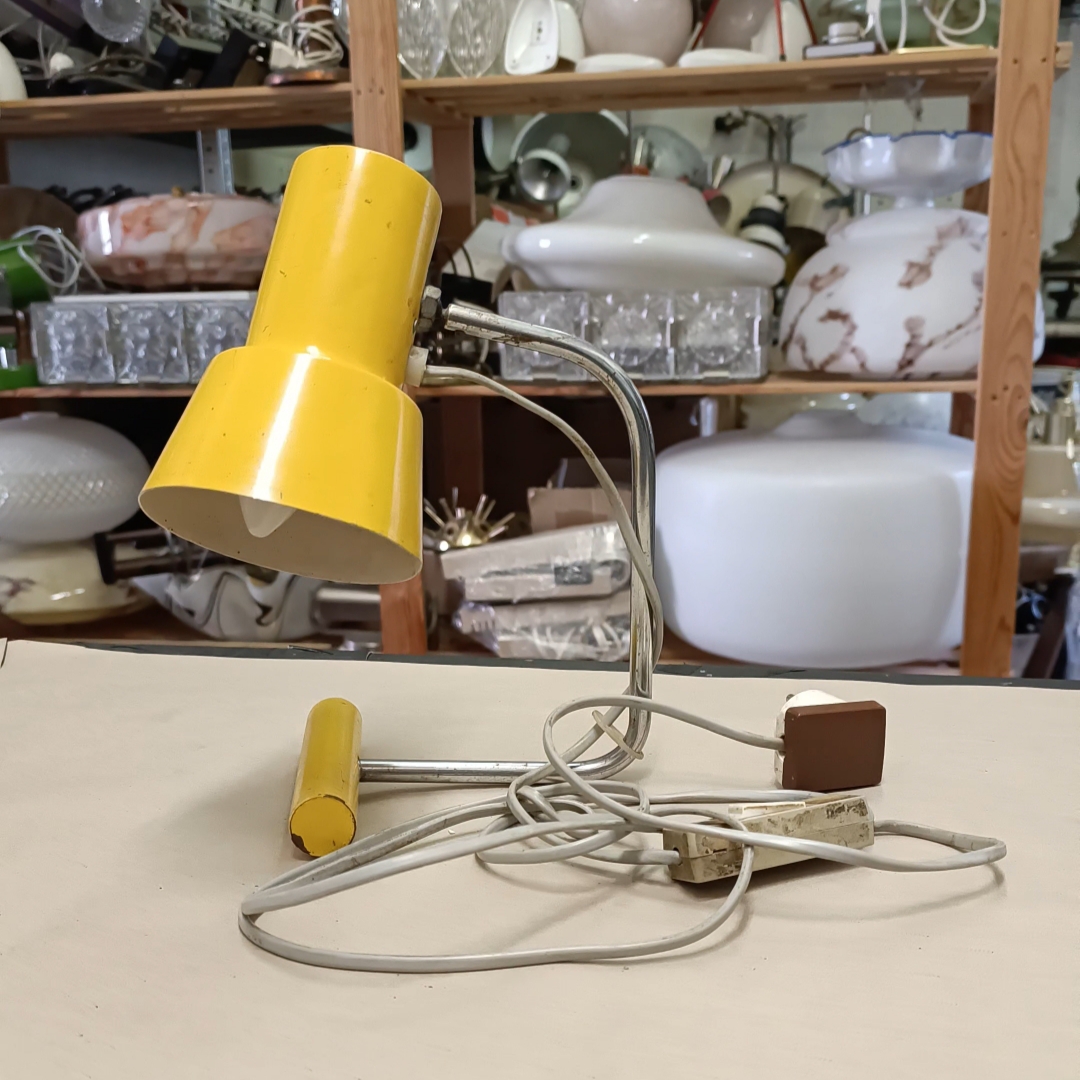 Lampu jsem rozebral do posledního šroubku a pečlivě vyčistil. Původní žluté lakování bylo již příliš poškozené na záchranu, takže jsem ji kompletně obrousil a nově nalakoval vypalovaným lakem. Chromované povrchy jsem zbavil zoxidovaného povlaku a rzi, vyleštil do lesku se zachováním mírné autentické patiny. Povrch jsem poté ještě zakonzeroval tenkou vrstvou ochranného laku. Vnitřek stínidla je nově nalakovaný bílou barvou. Nakonec dostala lampa kompletně novou elektroinstalaci v podobě nové textilní přívodní šňůry v žluto černé barevné kombinaci, objímky, vypínače a zástrčky.