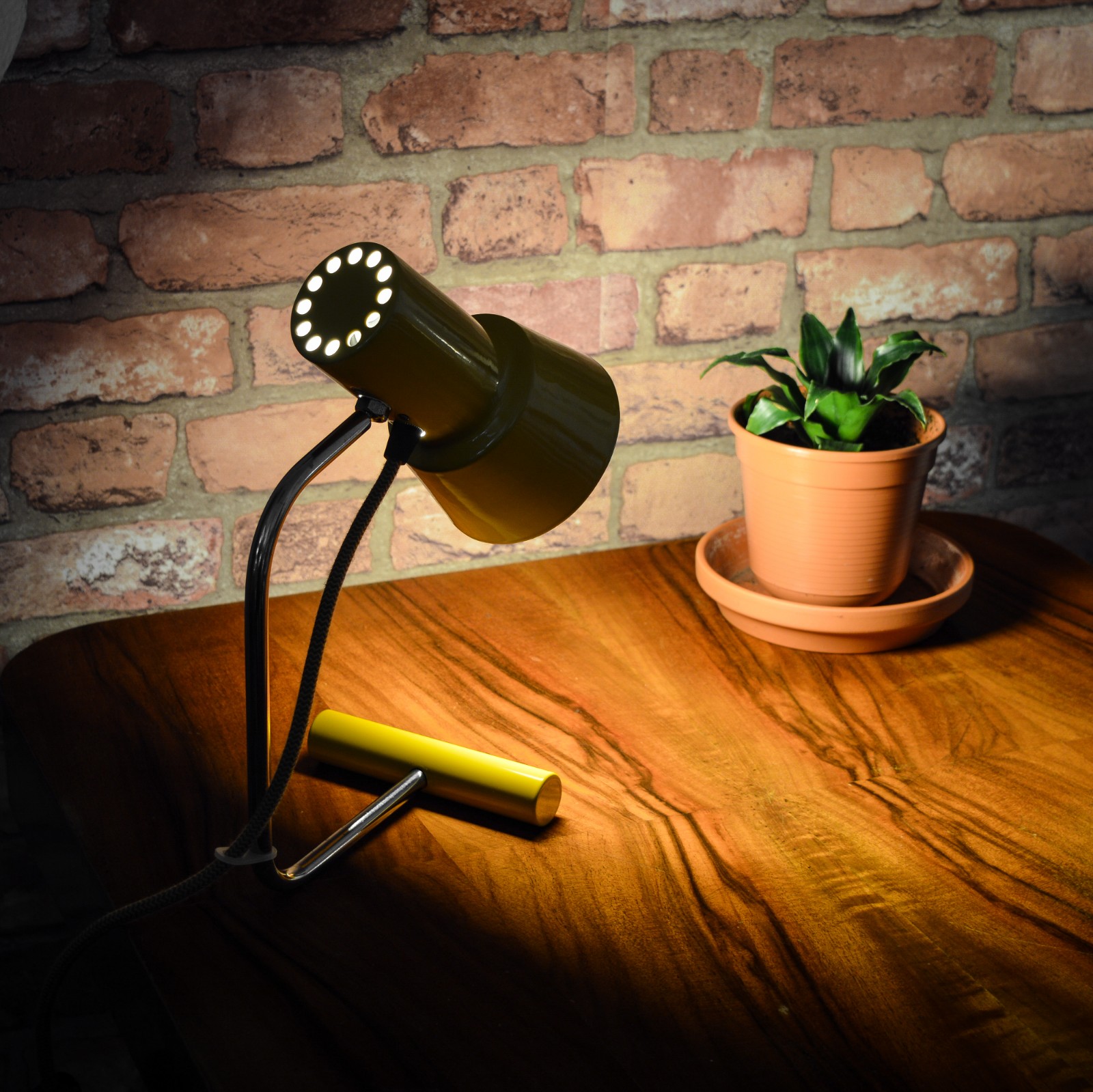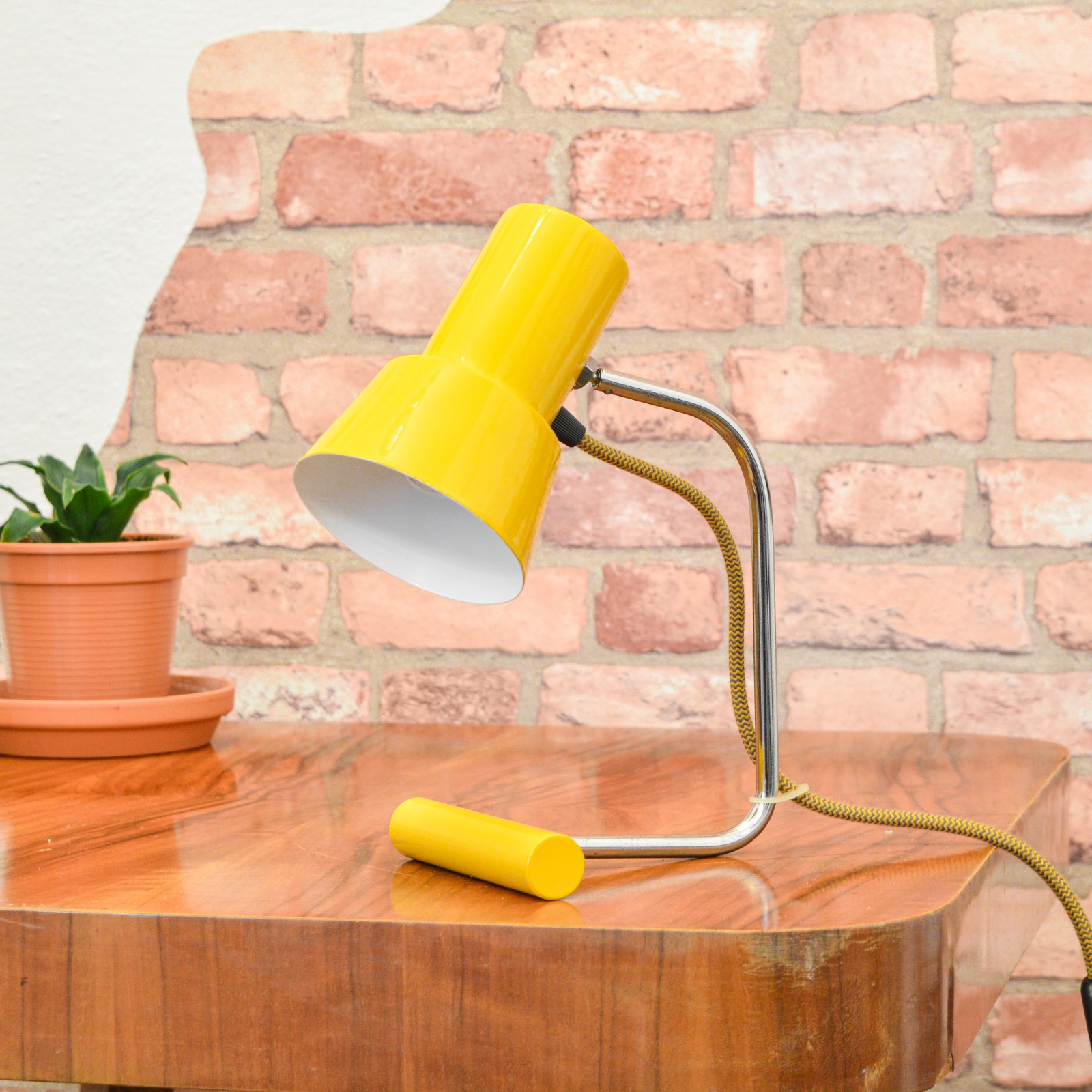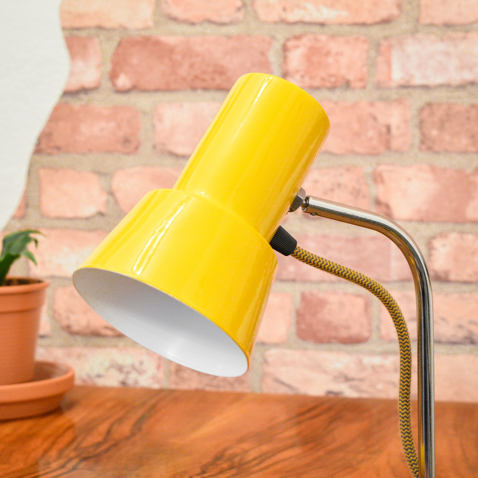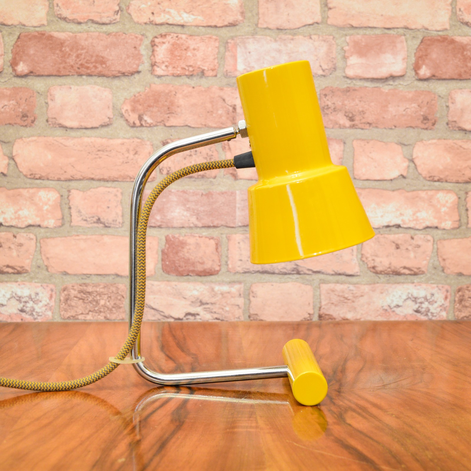 Lampu jsem rozebral do posledního šroubku a pečlivě vyčistil. Původní žluté lakování bylo již příliš poškozené na záchranu, takže jsem ji kompletně obrousil a nově nalakoval vypalovaným lakem. Chromované povrchy jsem zbavil zoxidovaného povlaku a rzi, vyleštil do lesku se zachováním mírné autentické patiny. Povrch jsem poté ještě zakonzeroval tenkou vrstvou ochranného laku. Vnitřek stínidla je nově nalakovaný bílou barvou. Nakonec dostala lampa kompletně novou elektroinstalaci v podobě nové textilní přívodní šňůry v žluto černé barevné kombinaci, objímky, vypínače a zástrčky.
