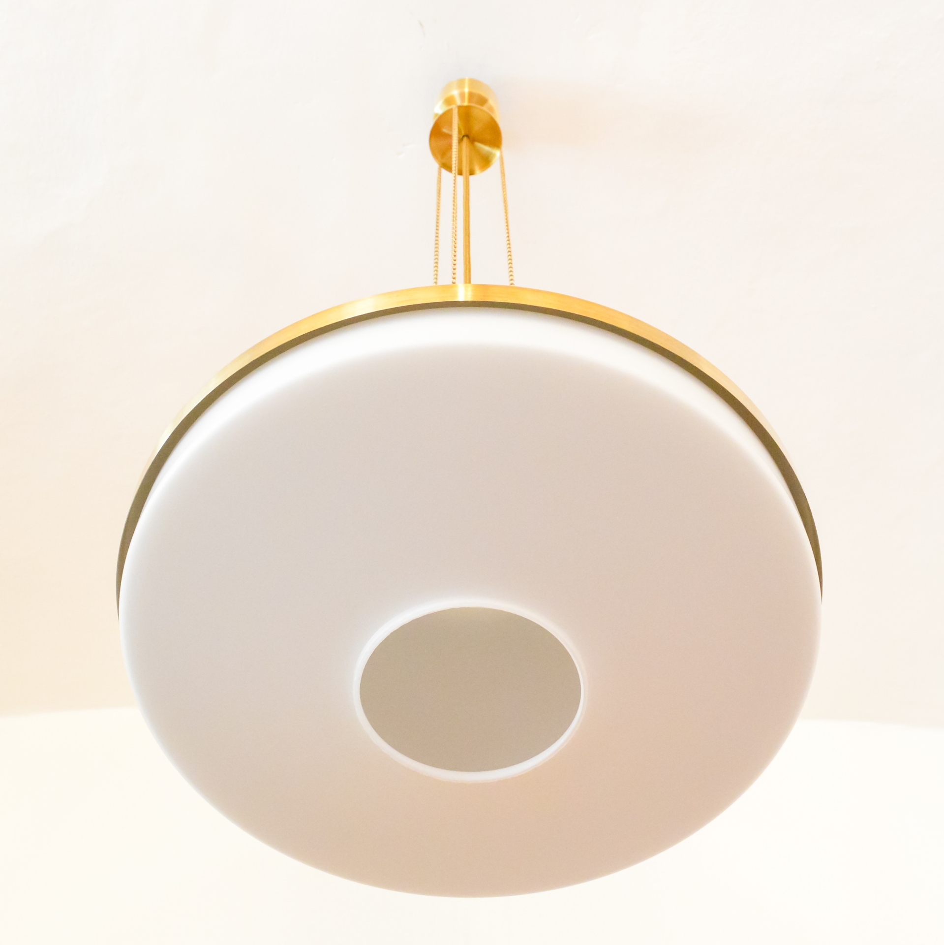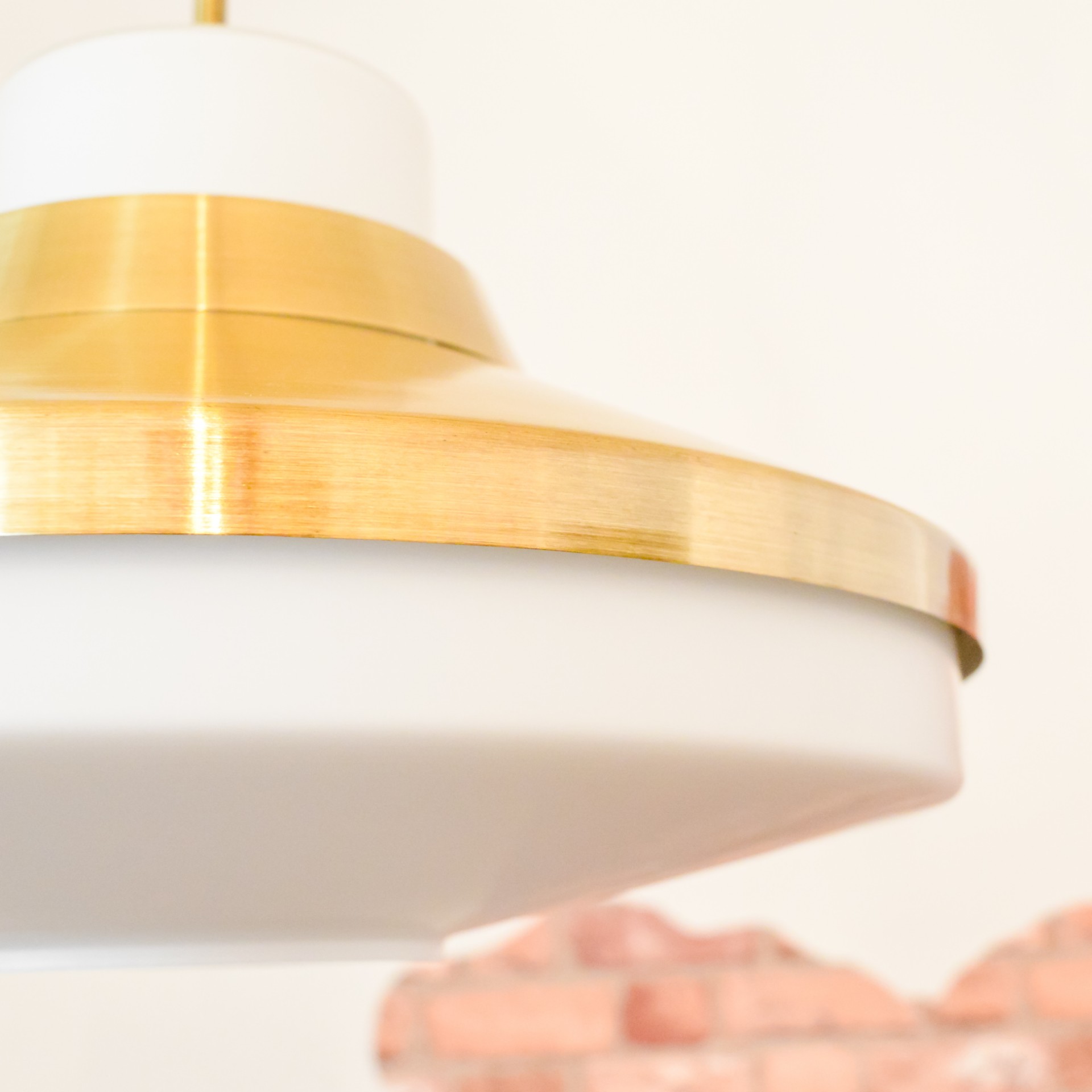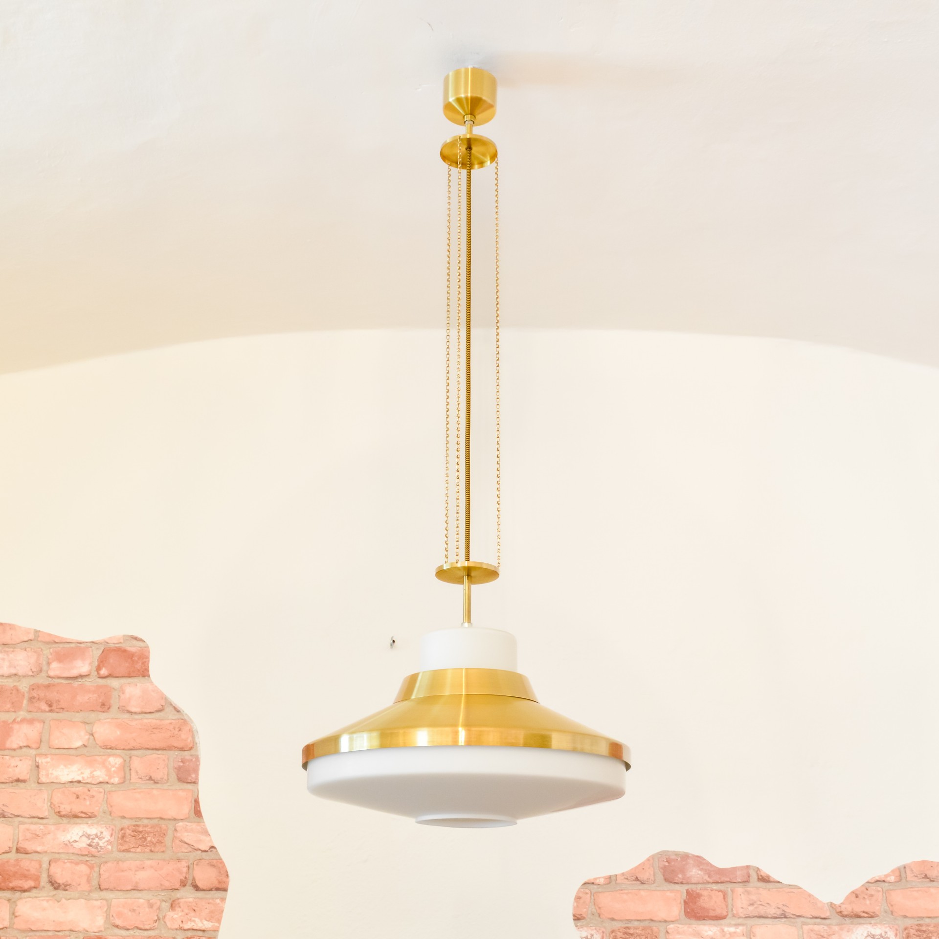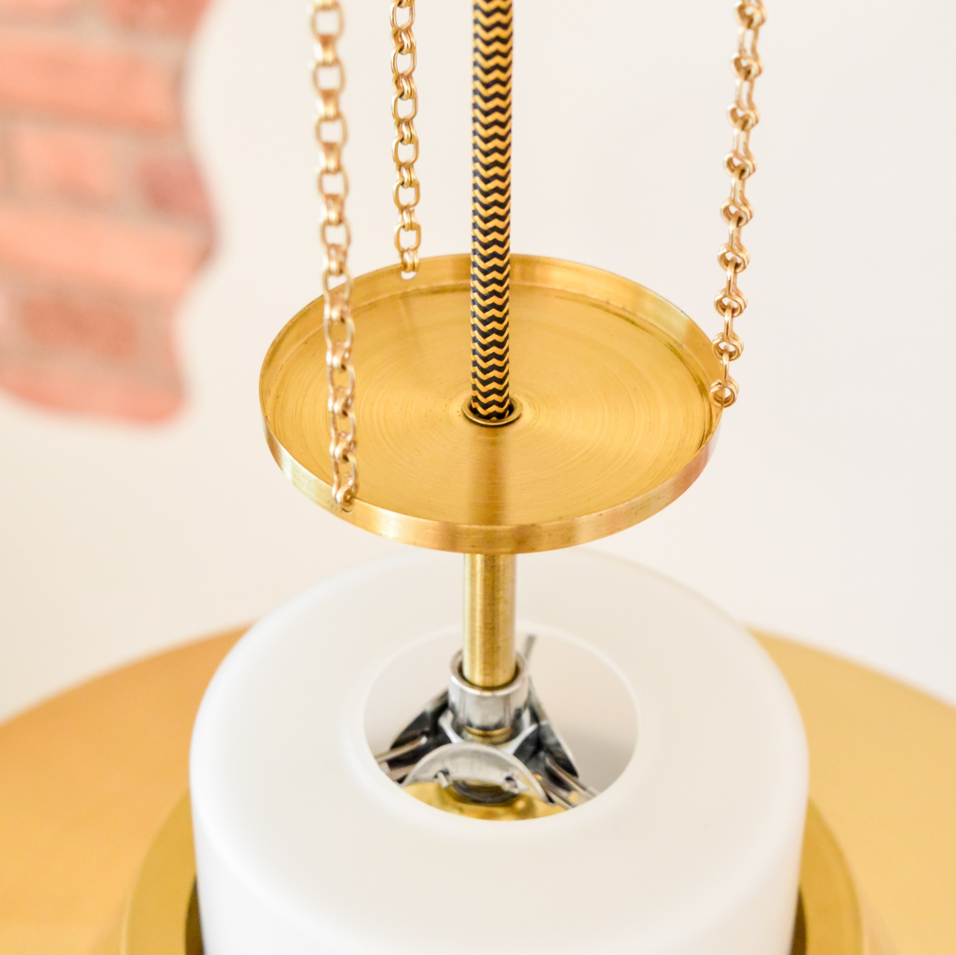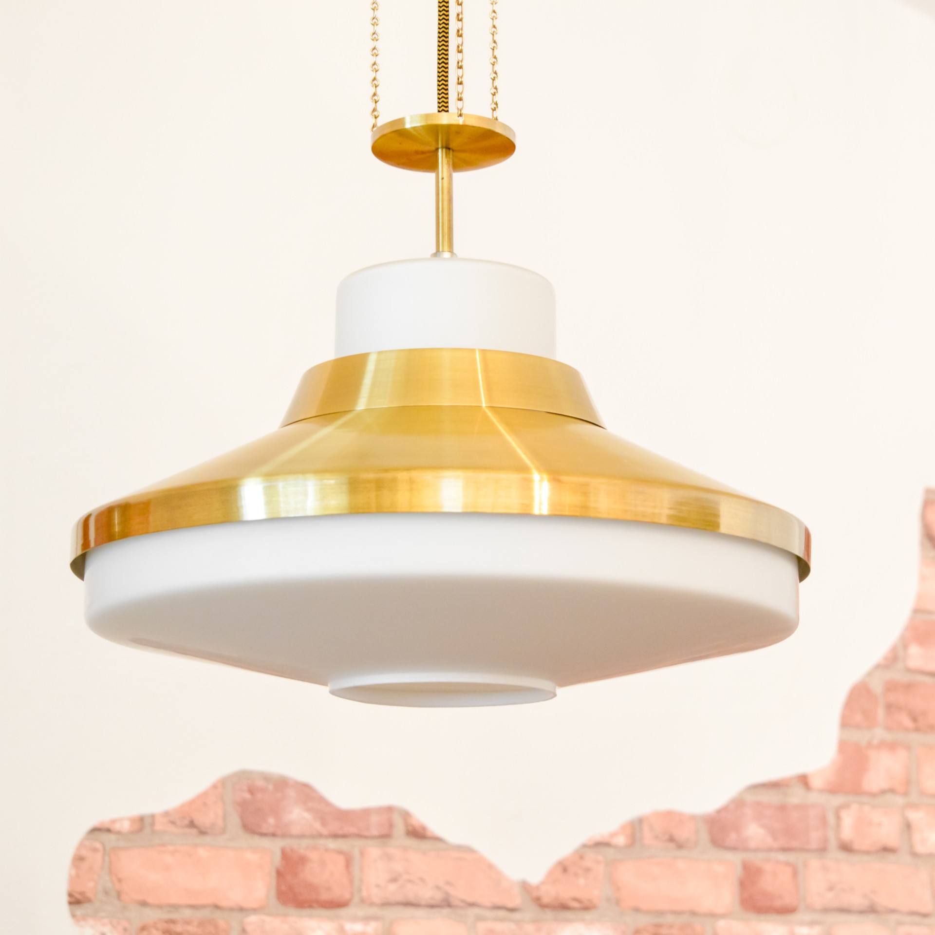 Okouzlující zlatobílý lustr od tehdejšího československého podniku NAPAKO, vyrobený v 70. letech, pravděpodobně podle návrhu Josefa Hůrky. Hlavní dominantou lustru je velké stínidlo z bílého opálového skla, které doplňují mosazné prstence kopírující tvar skla a také celomosazný závěs. U mosazných částí je zachována přírodní zlatá barva kovu a jsou zalakovány čirým lakem. Pro sladění barev a ozvláštnění lustru jsem zvolil textilní kabel ve zlato černé barevné kombinaci.