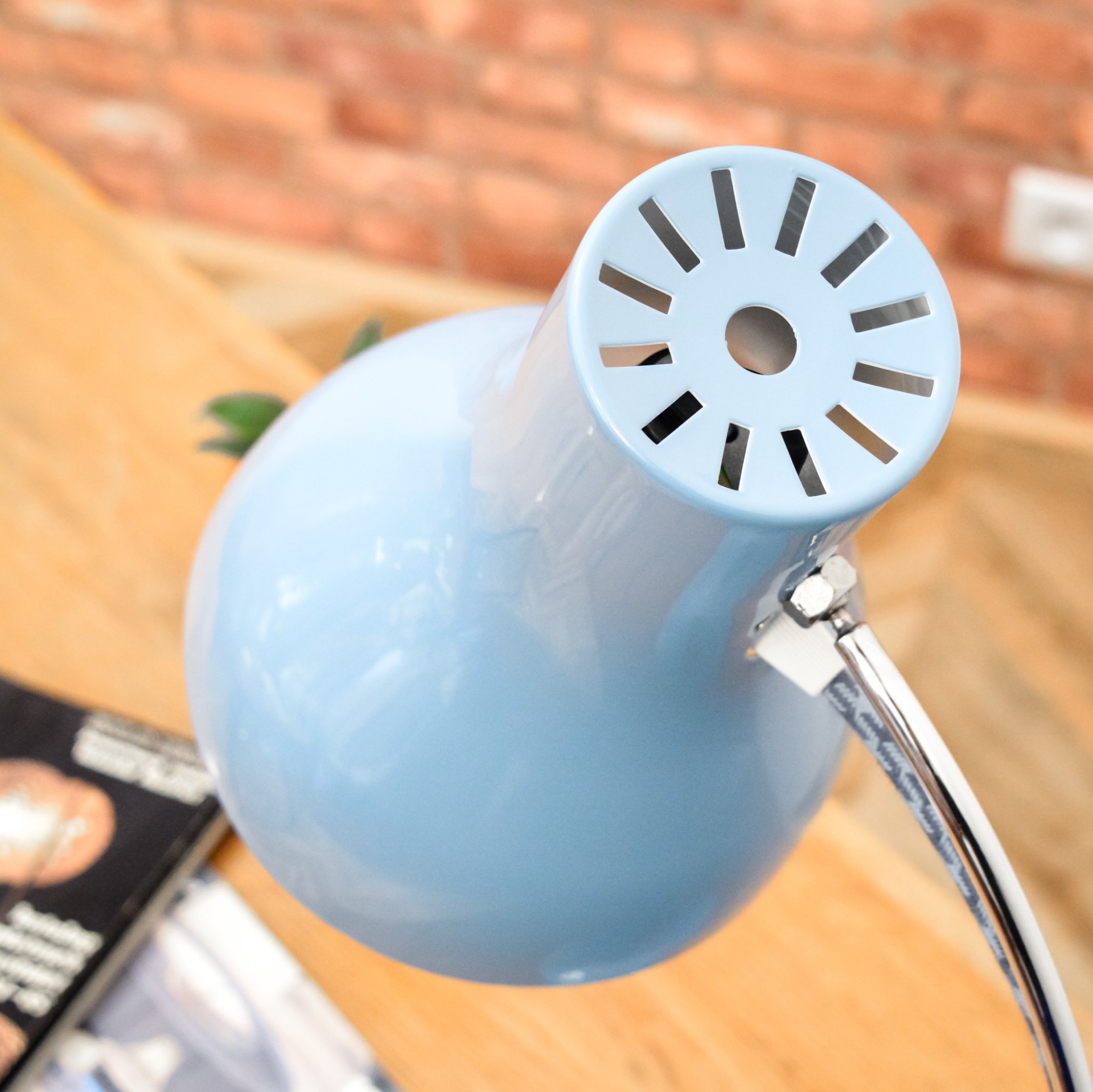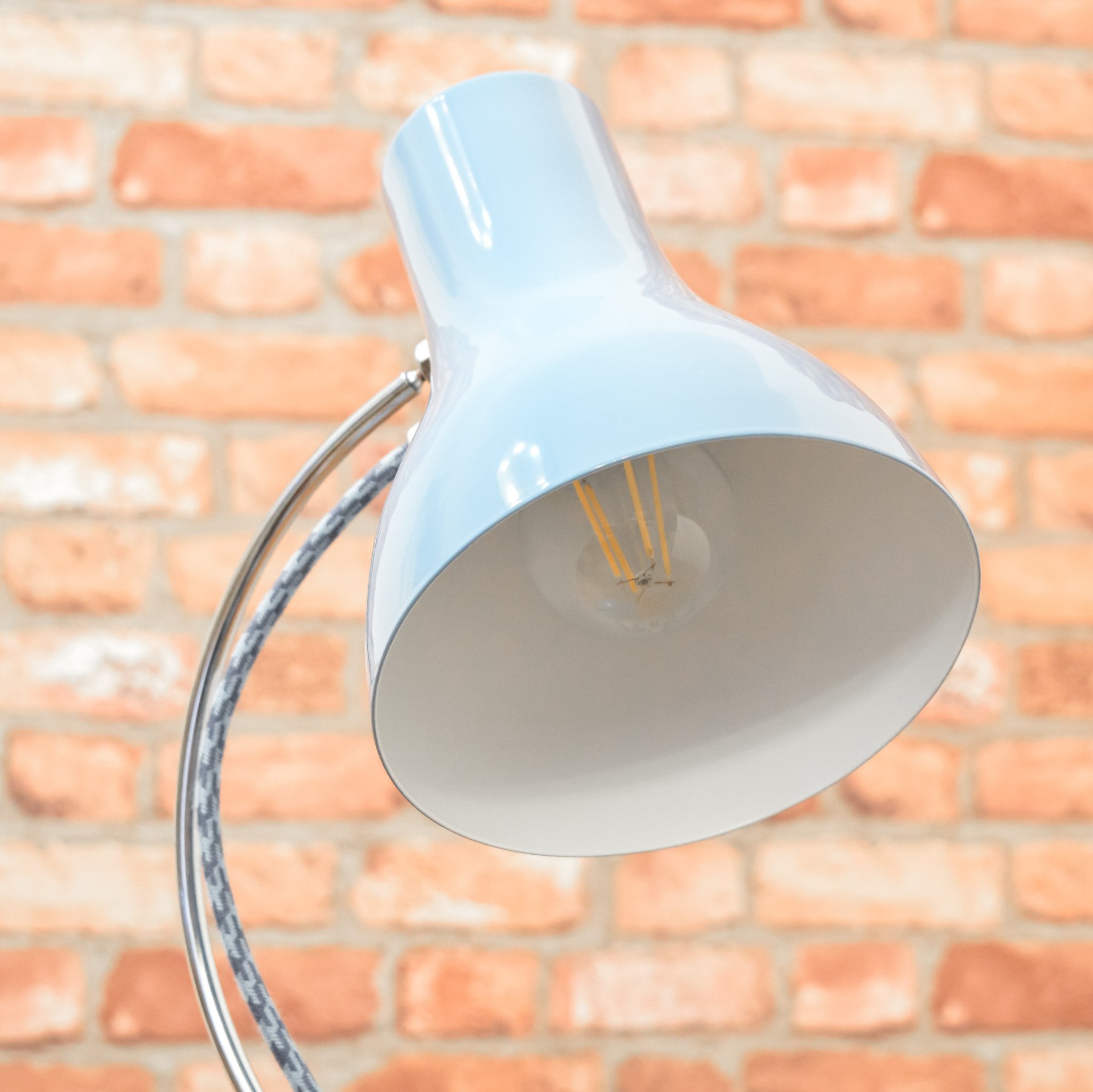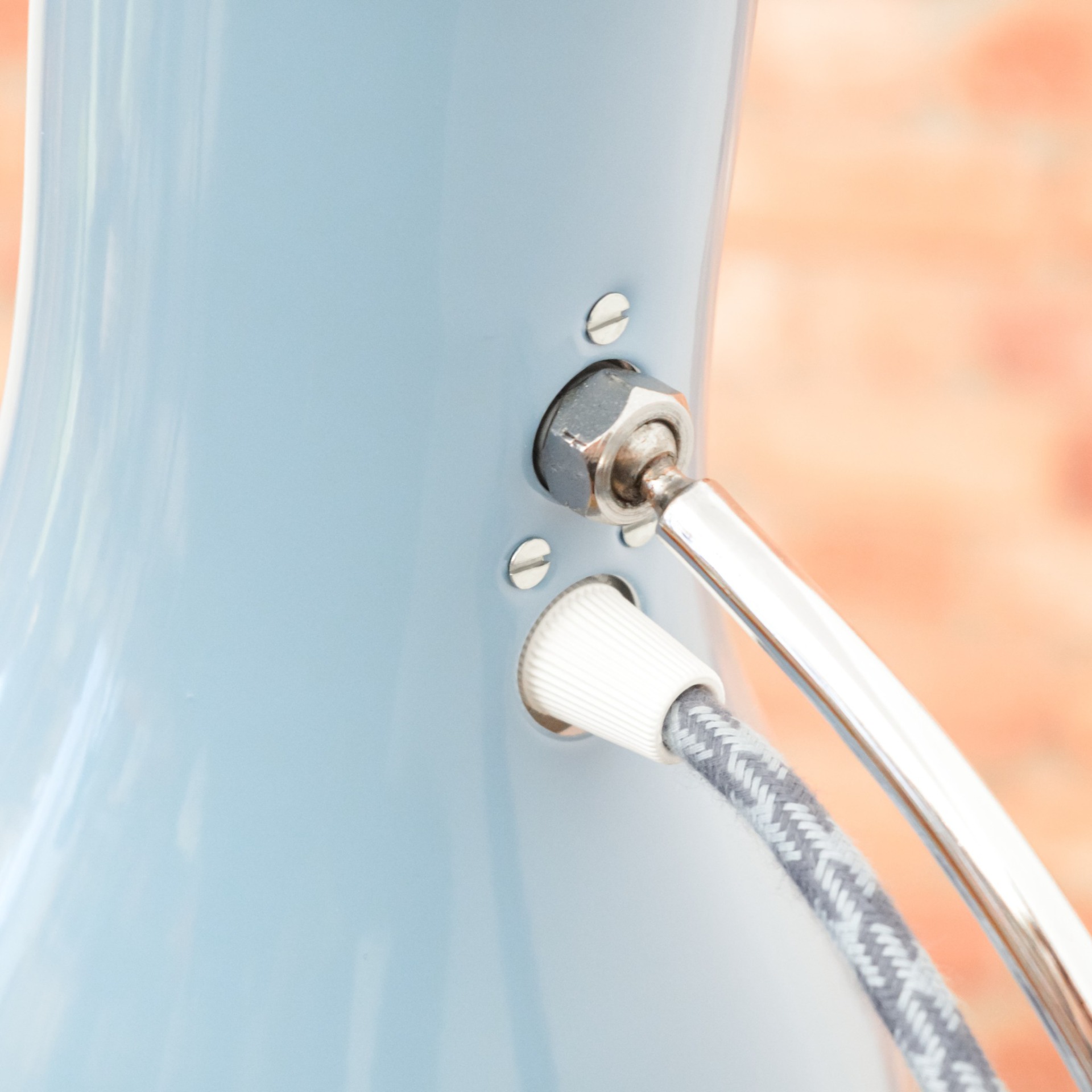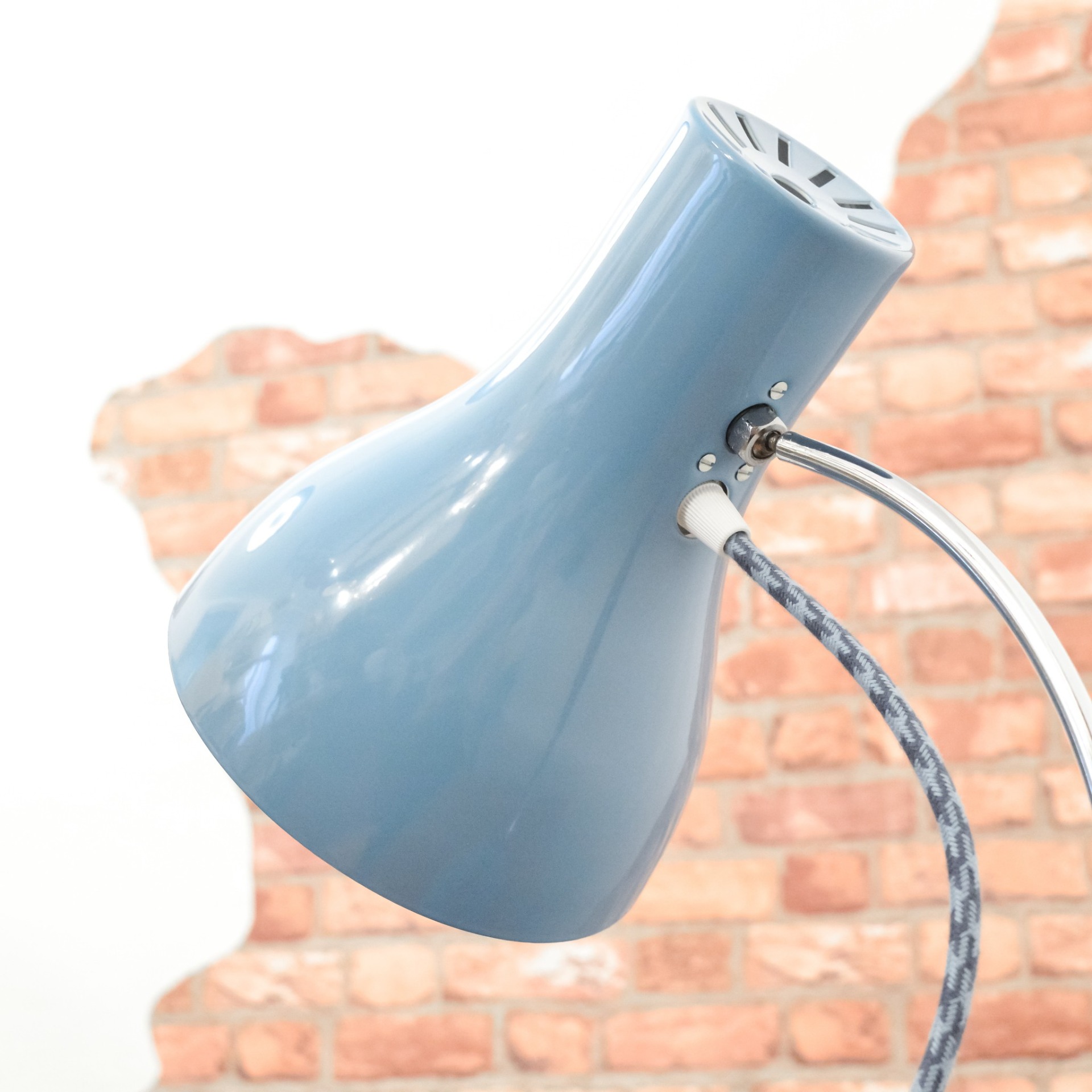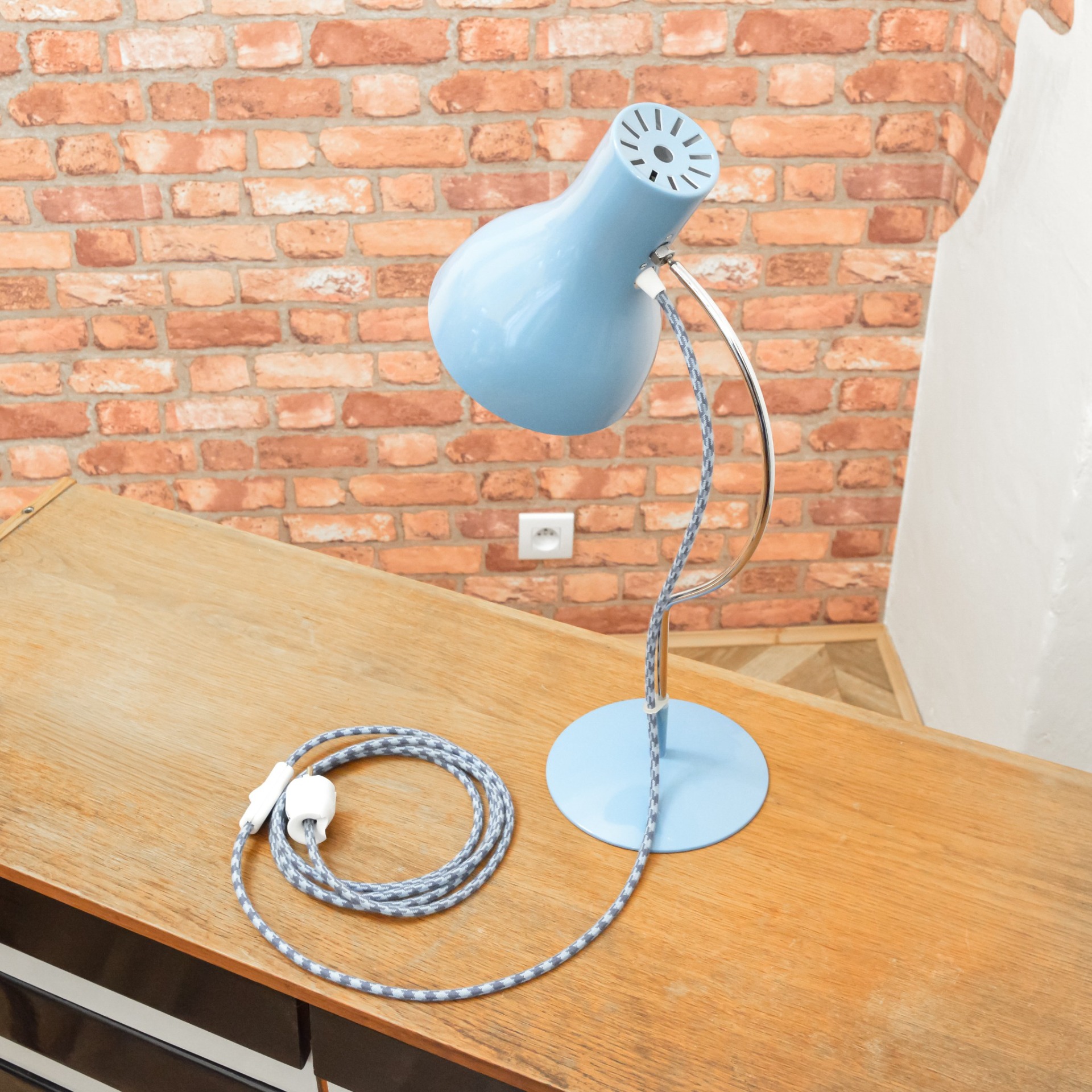 Stav lampičky byl před renovací velmi žalostný. Původní lak už byl celý odřený a místy napadený korozí. Kompletně jsem tedy lak obrousil a nechal nově nalakovat vypalovaným lakem v krásné pastelově modré barvě. Nový bílý lak dostal také vnitřek stínidla. Následně jsem zachovalé chromované povrchy zbavil zoxidovaného povlaku a vyleštil do vysokého lesku se zachováním mírné autentické patiny. Nakonec dostala lampička kompletně novou elektroinstalaci v podobě nové textilní přívodní šňůry v modro šedé barevné kombinaci, objímky, vypínače a zástrčky.