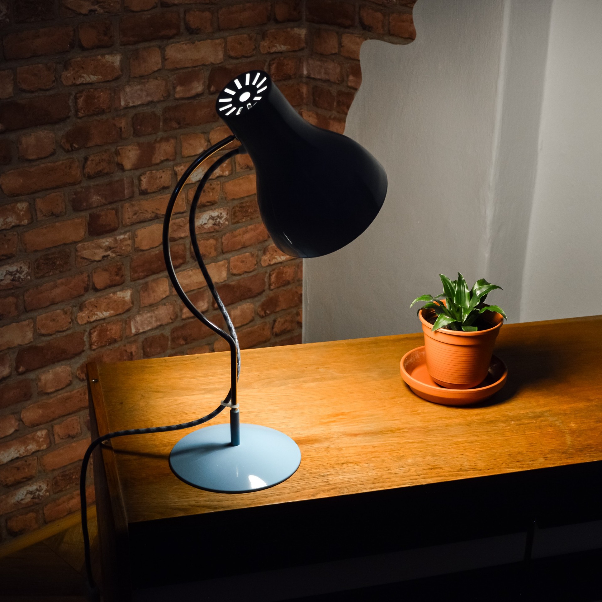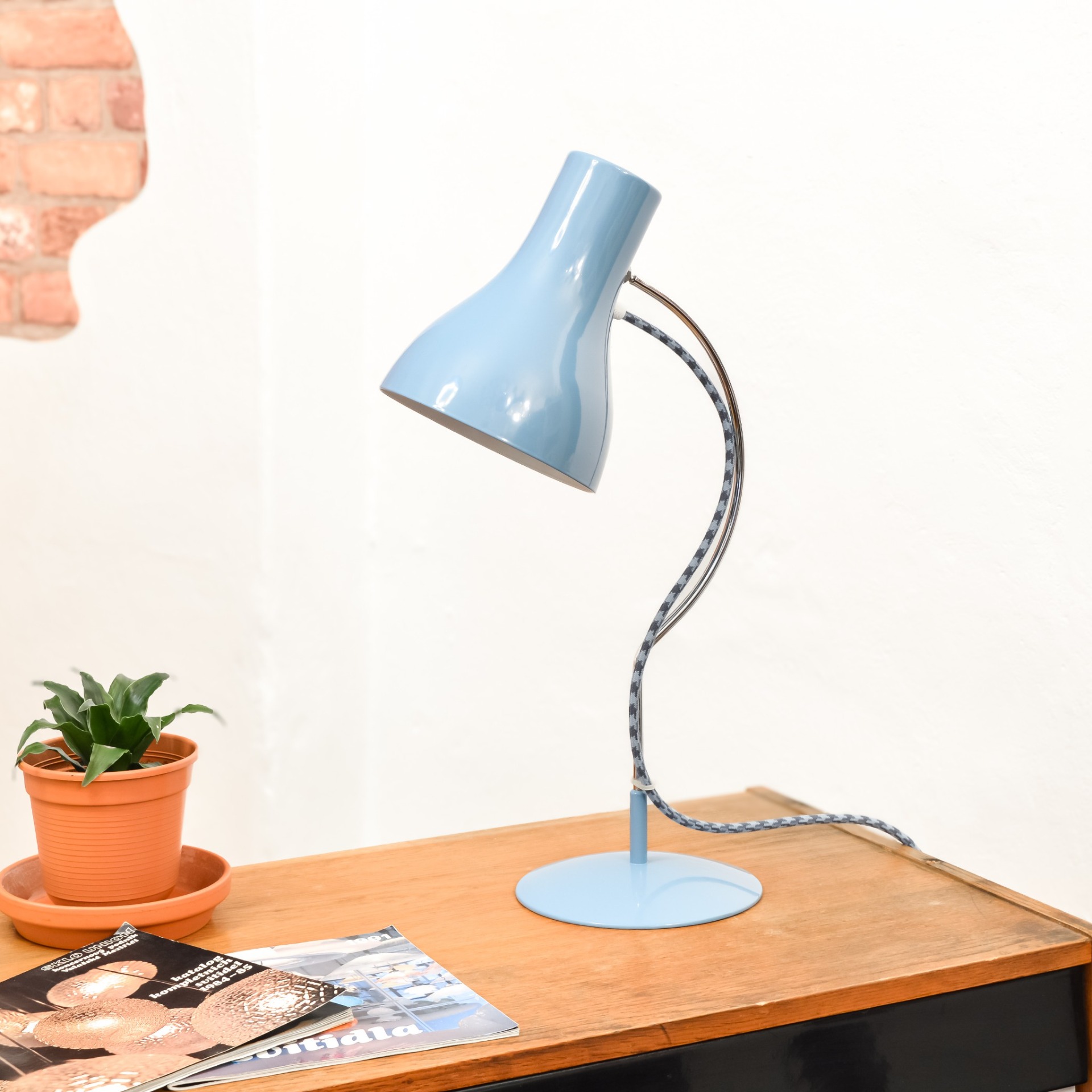 Ikonická stolní lampa od československého podniku NAPAKO v nové netradiční pastelově modré barvě. Vyrobená v 70. letech, podle návrhu Josefa Hůrky. Kvalitně zpracovaná konstrukce z pevného kovu nese hlavní znaky návrhů J. Hůrky, a to co nejjednodušší funkční tvary. Stínidlo lze natáček ve všech směrech, díky sofistikovaně umístěnému kloubu.