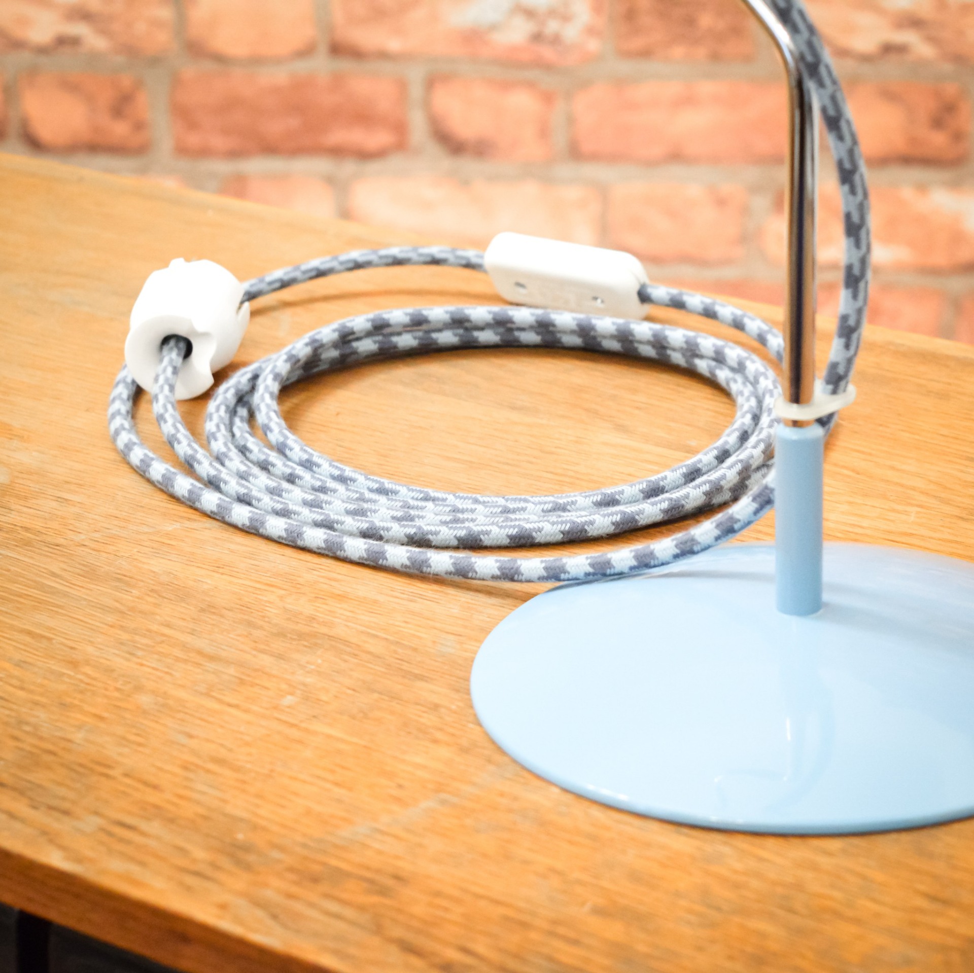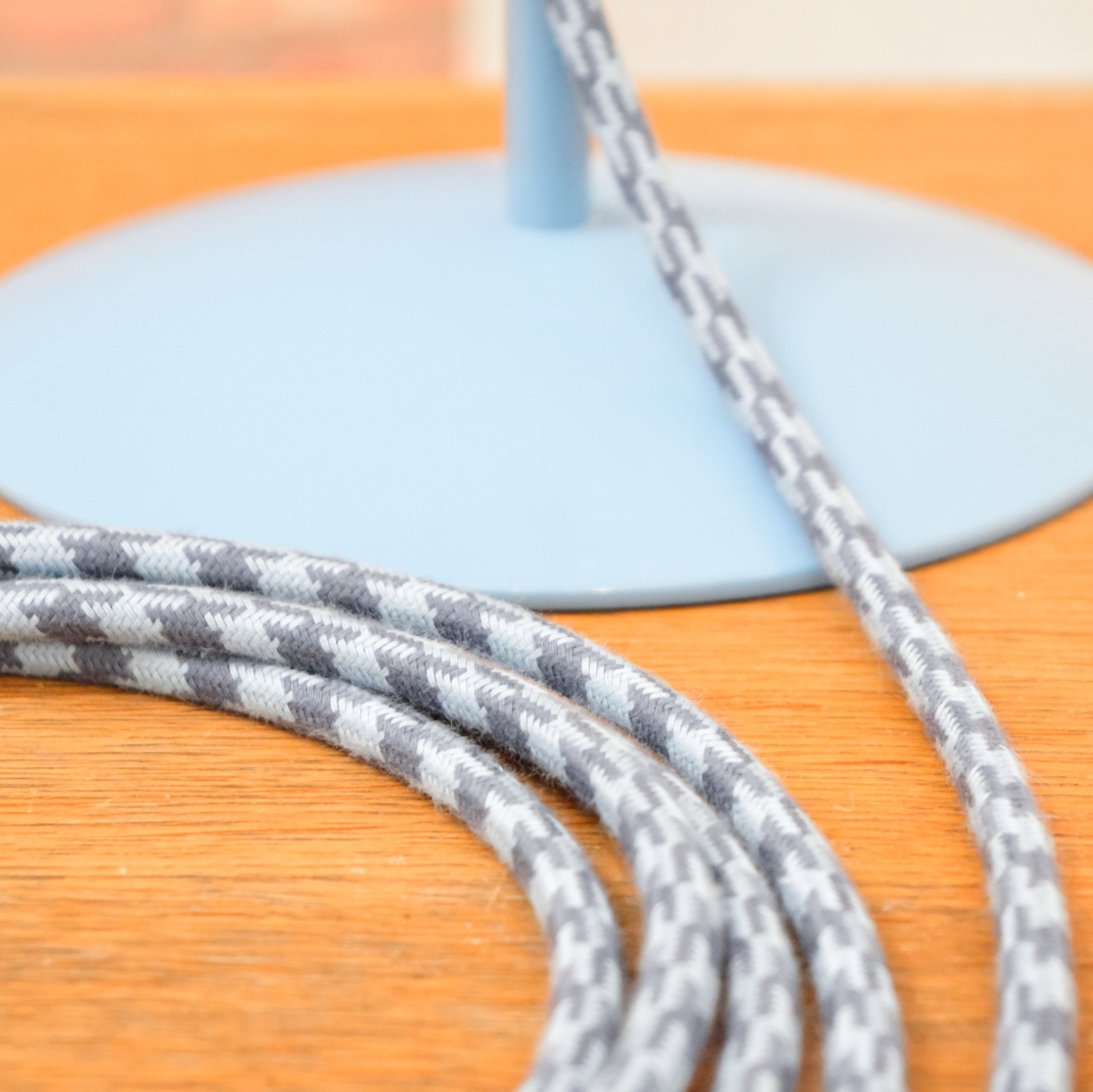 Pro sladění barev a ozvláštnění lampy jsem zvolil textilní kabel v modro šedé barevné kombinaci.