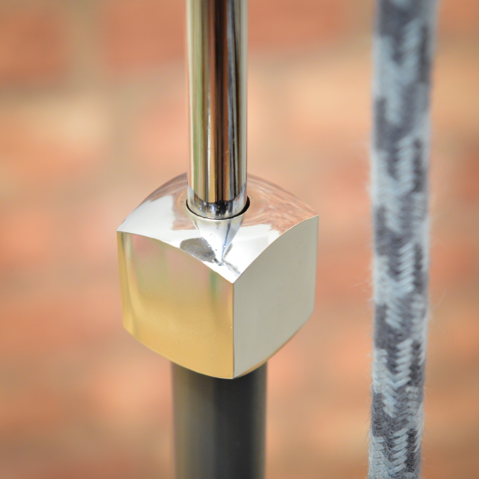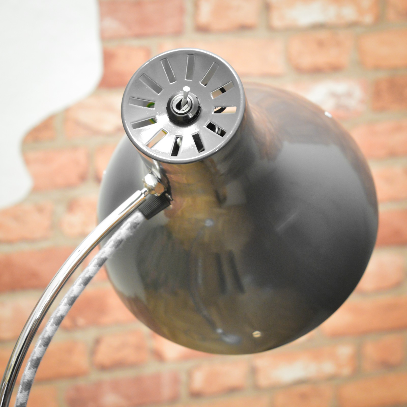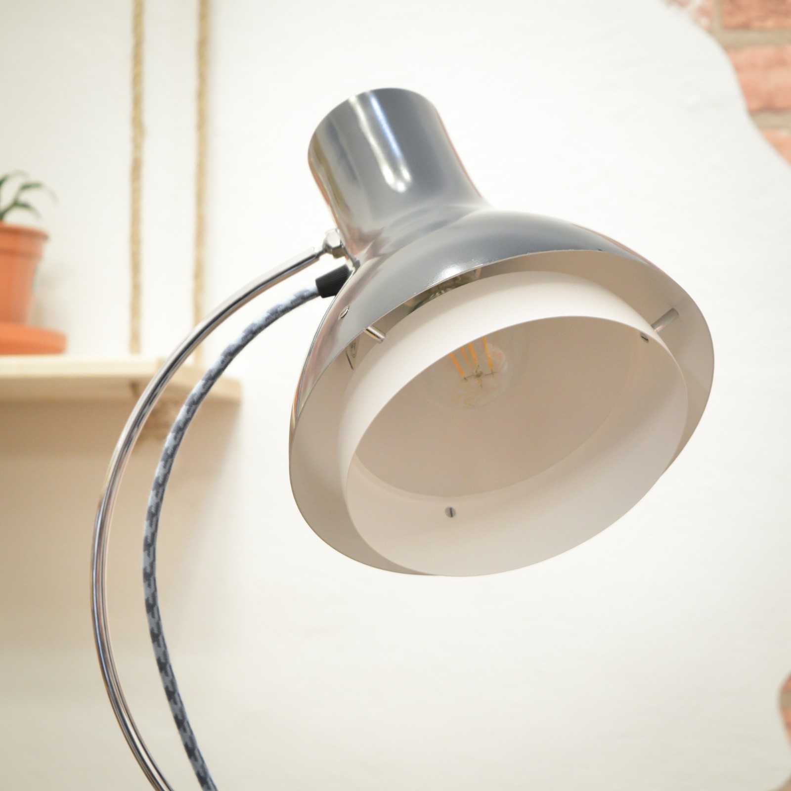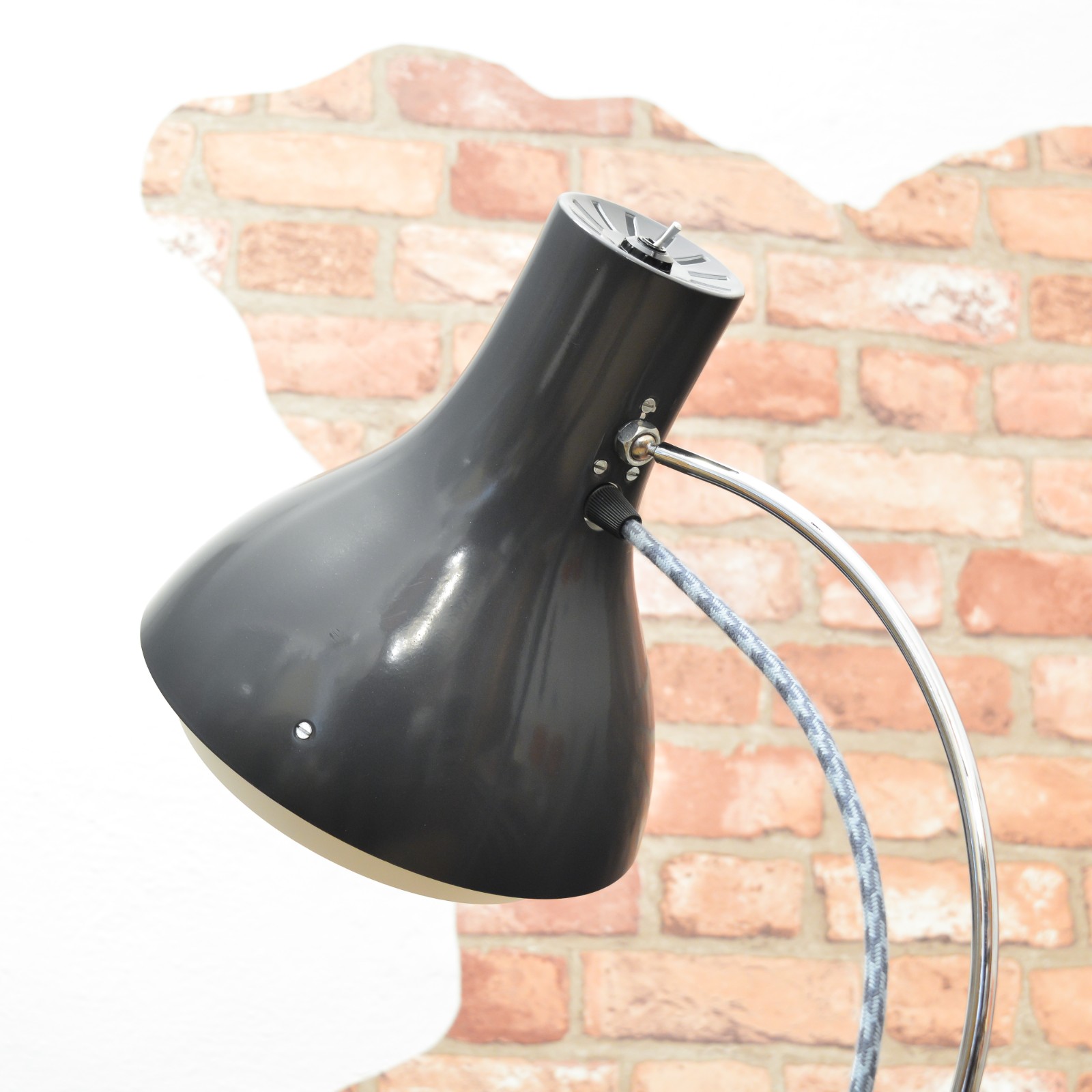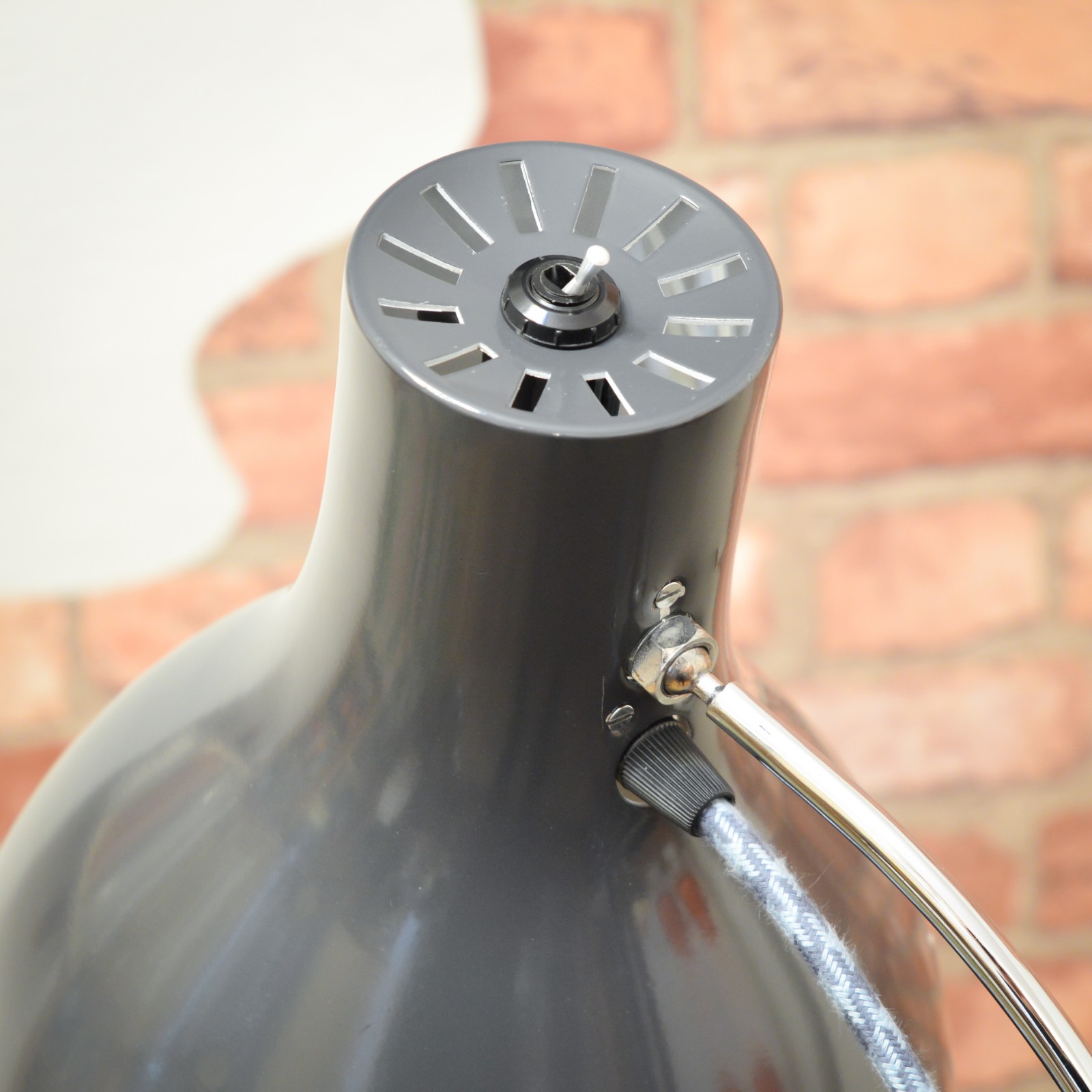 Lampu jsem rozebral do posledního šroubku a pečlivě vyčistil. Následně jsem krásně zachovalé chromované a lakované povrchy zbavil zoxidovaného povlaku a rzi a vyleštil do lesku se zachováním mírné autentické patiny. Povrchy jsem poté ještě zakonzeroval tenkou vrstvou ochranného vosku. Vnitřní plochy stínidla jsou nově nalakované bílou barvou. Nakonec dostala lampa kompletně novou elektroinstalaci v podobě nové textilní přívodní šňůry v šedo modré barevné kombinaci, objímky, designového vypínače a zástrčky.