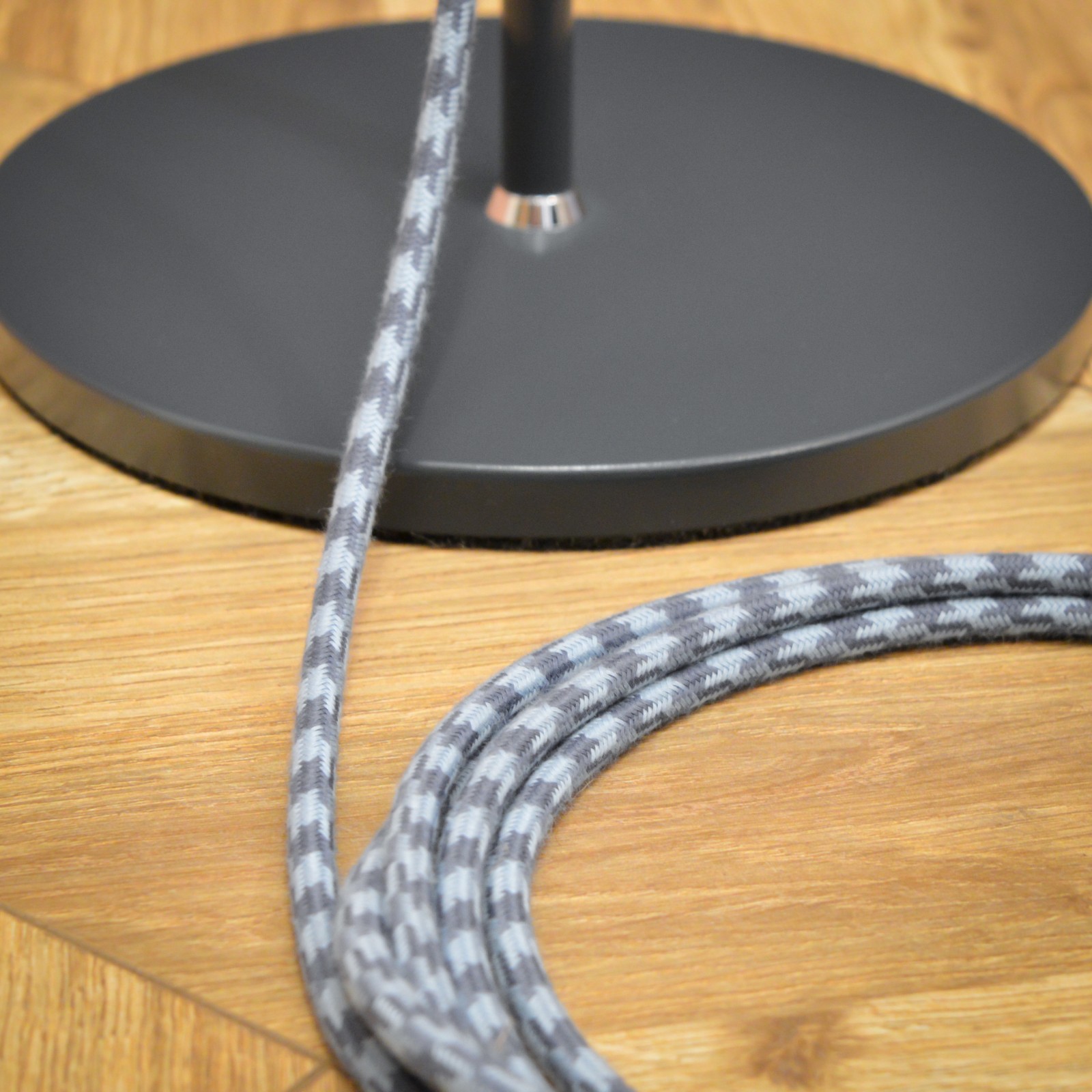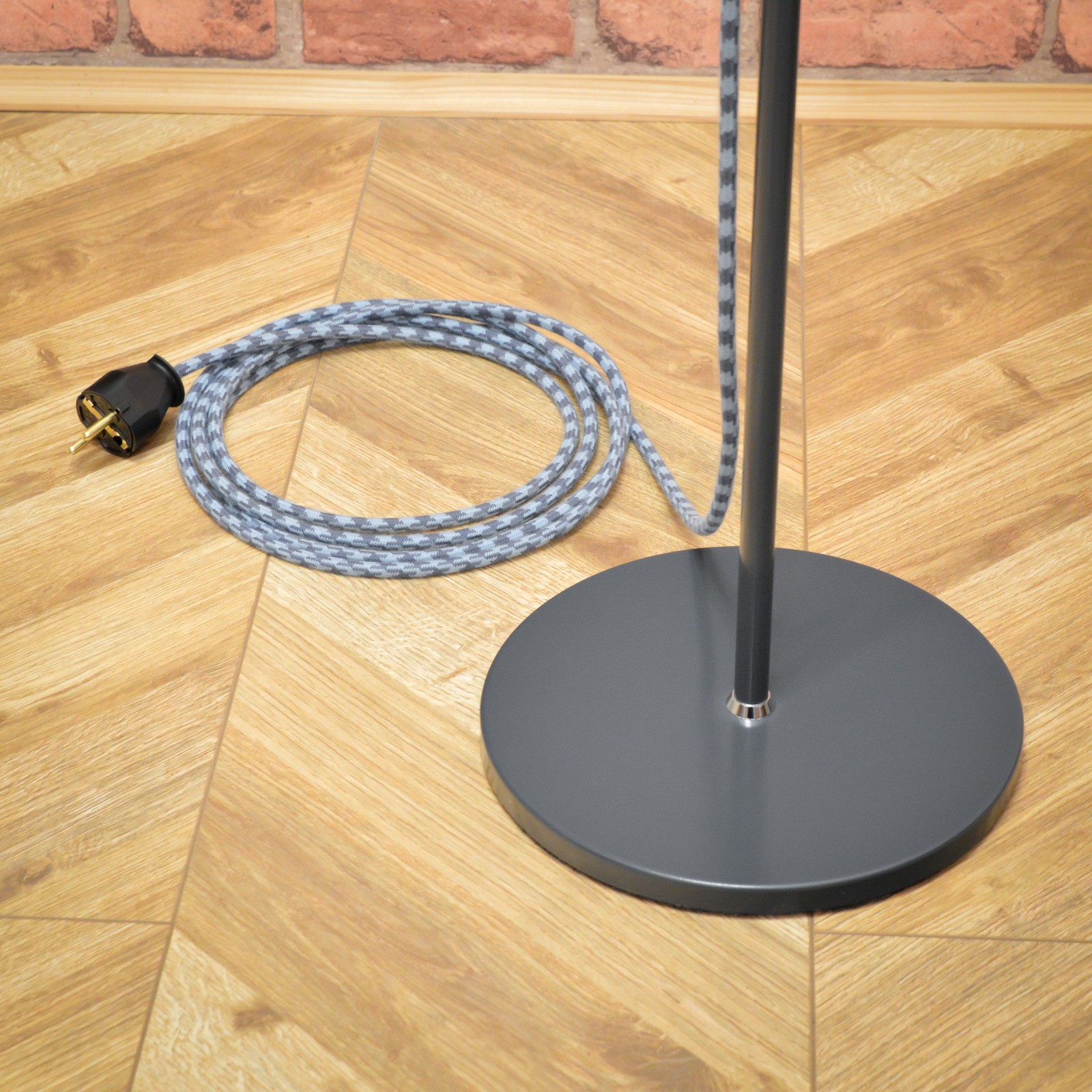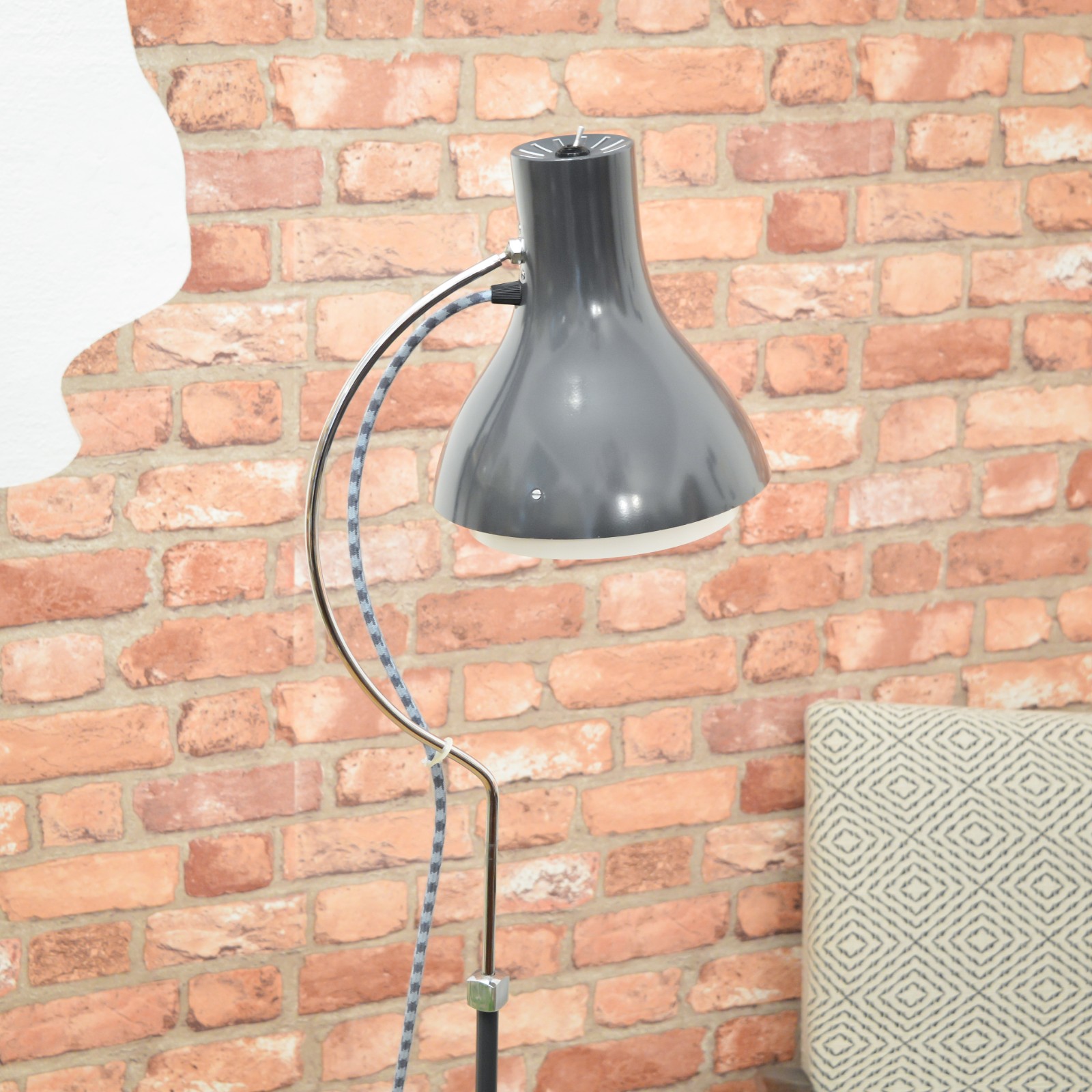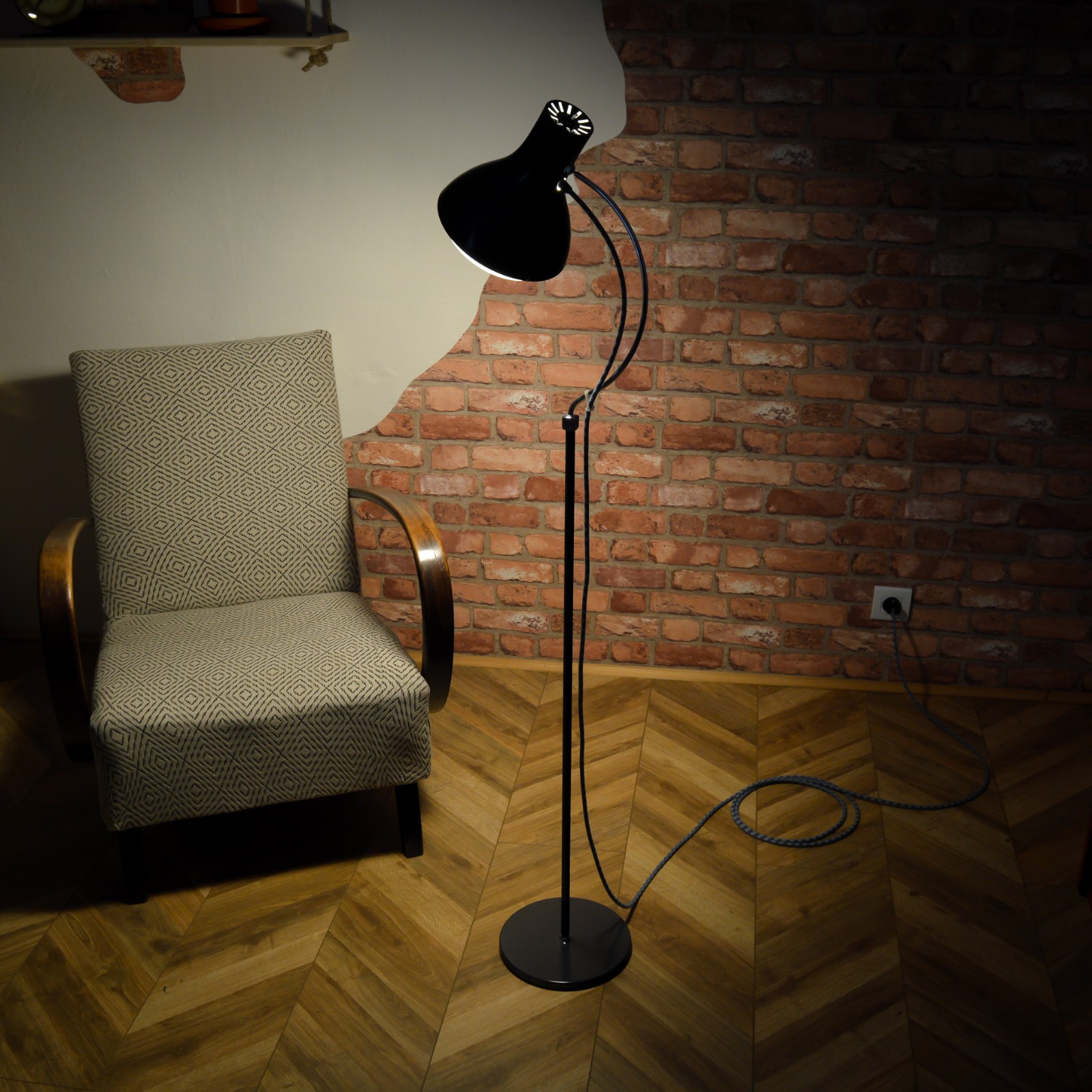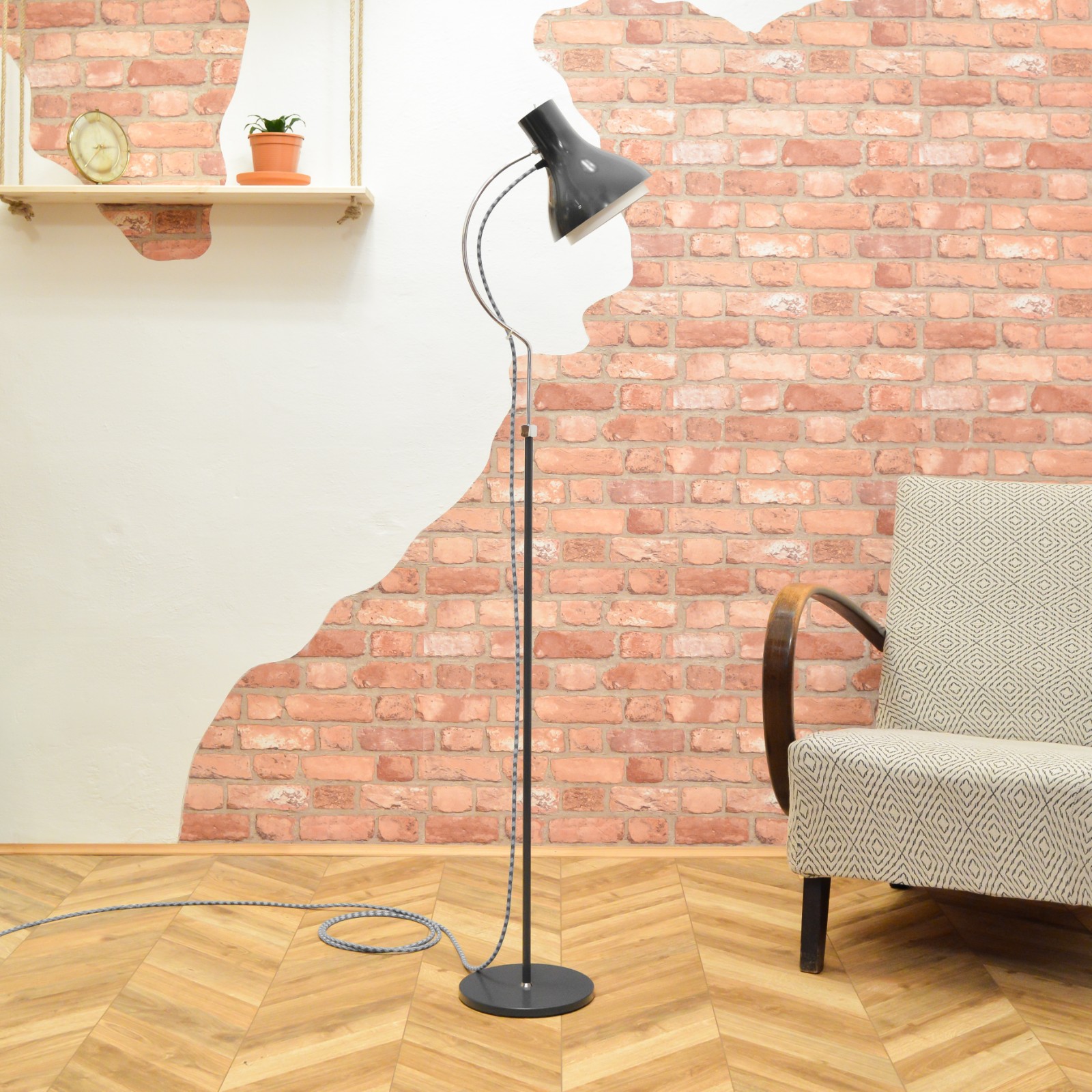 Elegantní podlahová lampa od československého podniku NAPAKO typ 1716, vyrobená v 70. letech, podle návrhu Josefa Hůrky. Jednoduché funkční tvary tipické pro návrhy J. Hůrky a decentní tmavě antracitová barva zaručují, že lampa hravě najde své místo v moderním interiéru. Stínidlo je výškově nastavitelné a lze ho také natáček ve všech směrech, díky sofistikovaně umístěnému kloubu. Konstrukce lampy je celá kvalitně zpracována z pevného kovu. Pro sladění barev a ozvláštnění lampy jsem zvolil textilní kabel v šedo modré barevné kombinaci a černé komponenty. Pro pohodlnější zapínání dostala lampa páčkový vypínač.