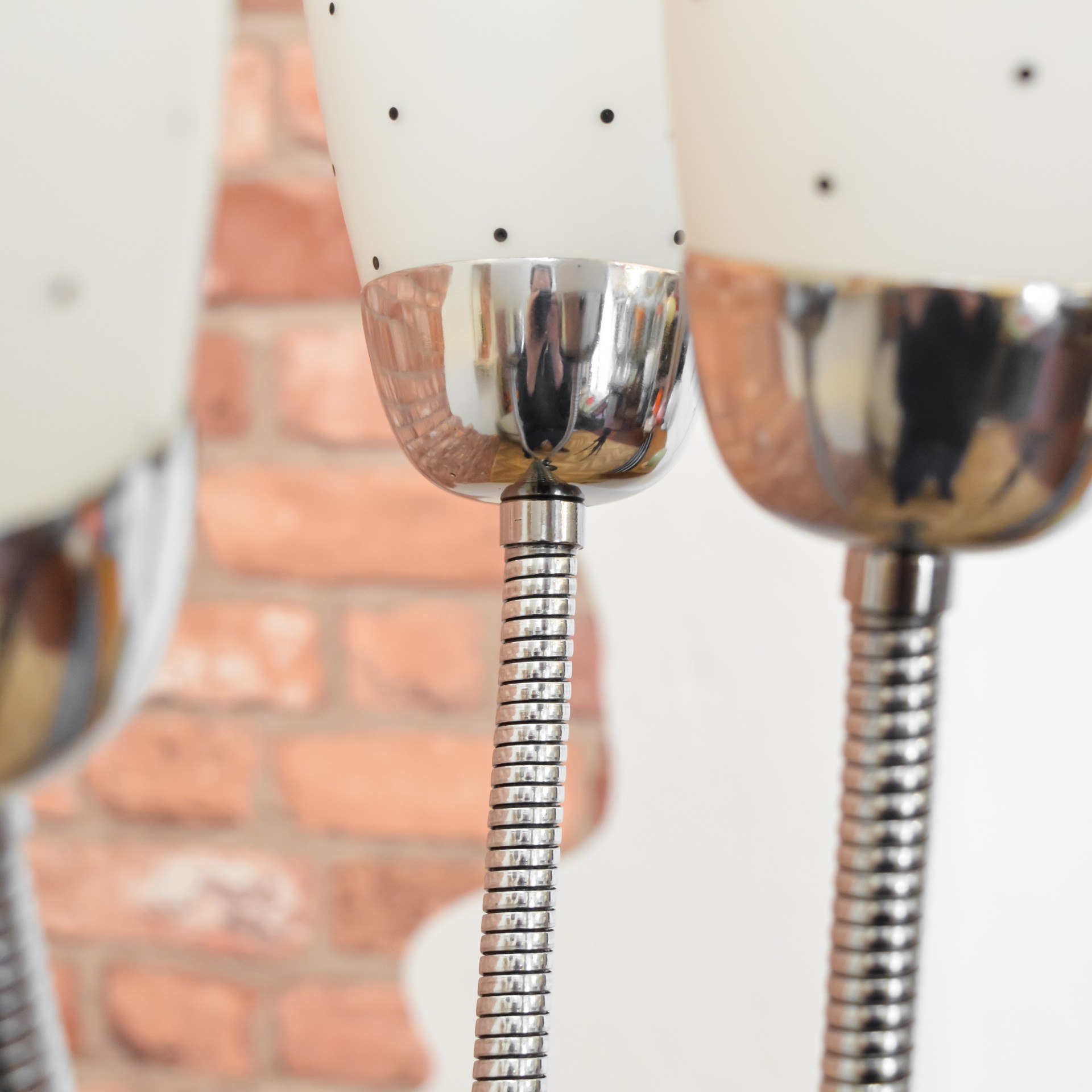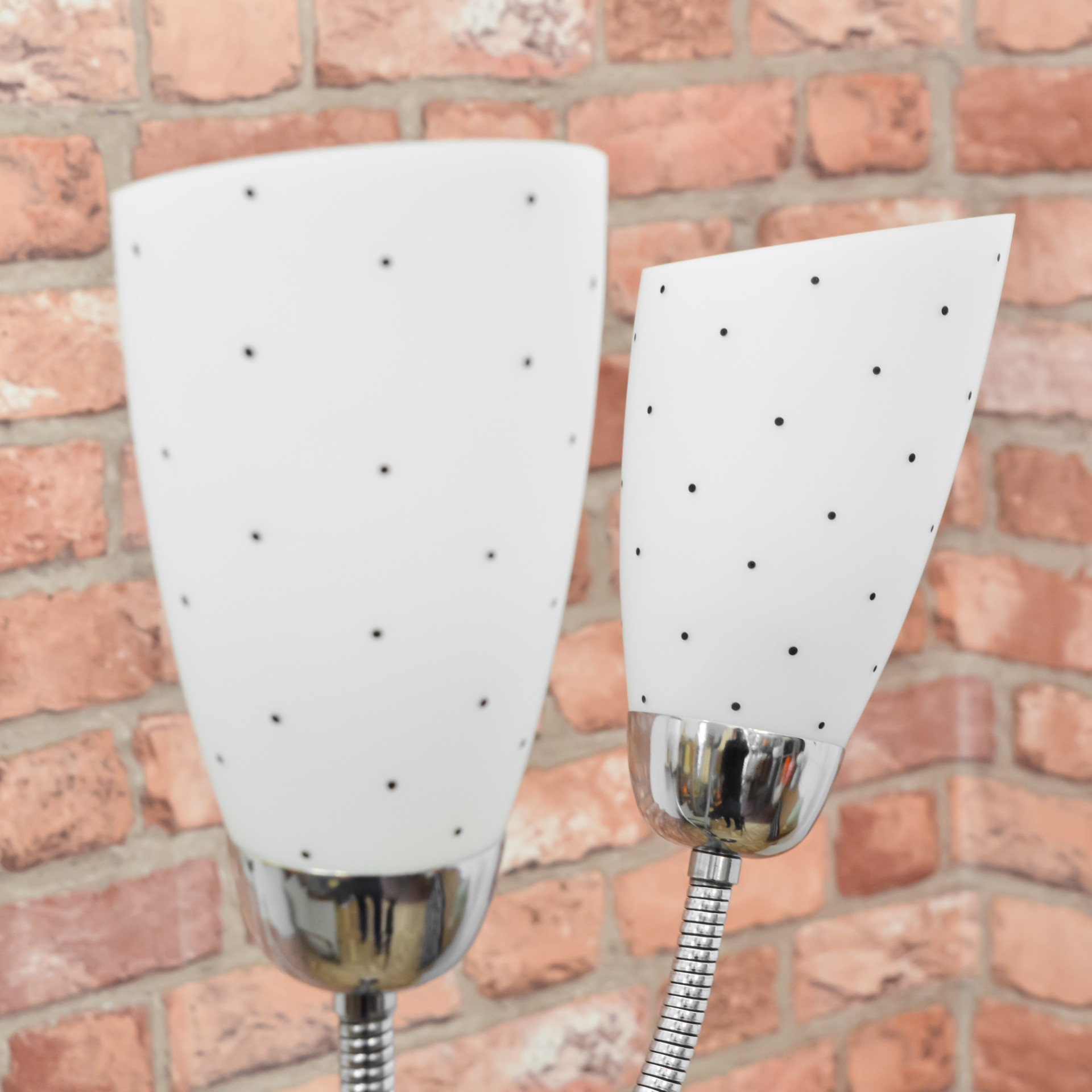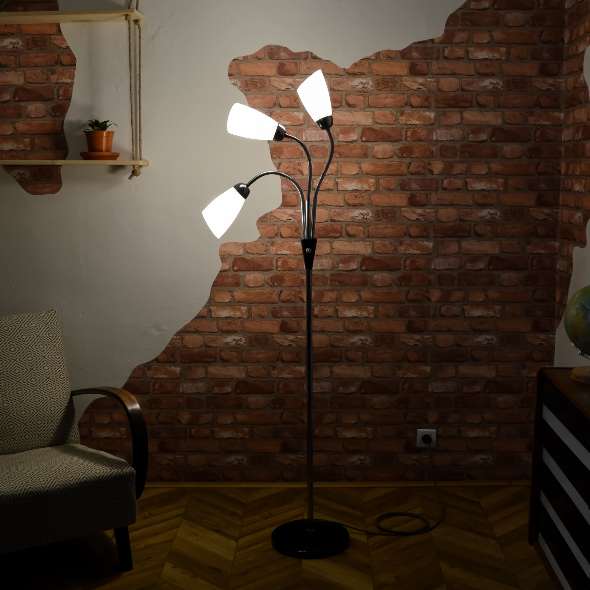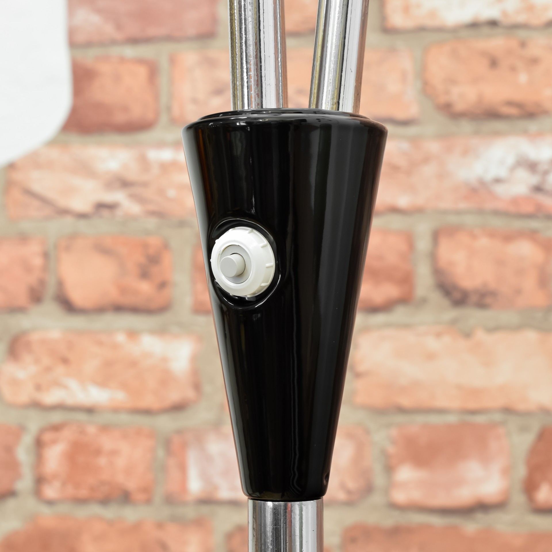 Jedna z ikon bruselské éry v Československu. Stojací lampa z přelomu 50. a 60. let od tehdejšího podniku Lidokov Boskovice ve zbrusu novém černobílém hávu.